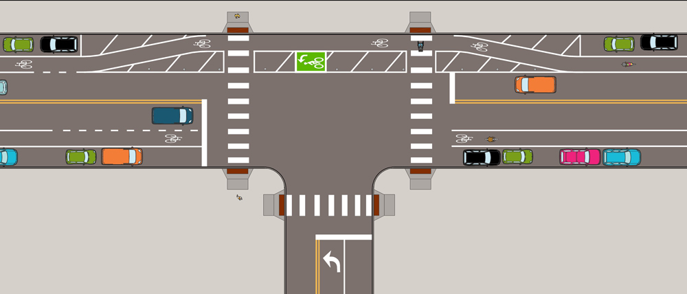 When adequate space is available, implement a buffer between the bike lane at the top of the T-intersection and the adjacent travel lane. Vertical delineation is preferred for on-street facilities. |