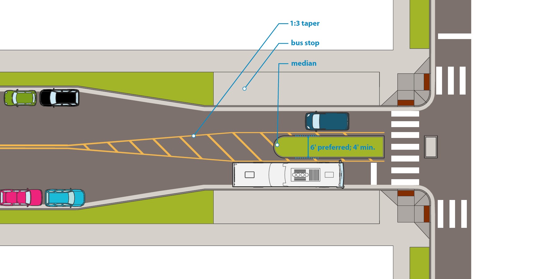 If there is parking, curb extensions should be implemented with bus stop to align with the bus doors. |