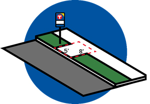 At the front door zone of every bus stop, a concrete accessible boarding area must be provided for ADA access. It must have a clear length of 8’ minimum, measured perpendicular to the curb or roadway edge, and a clear width of 5’ minimum, measured parallel to the roadway (see figure 3.5B.1). This space is where passengers enter and exit the bus, and where bus operators deploy the ramp for passengers using a mobility device, such as a wheelchair.